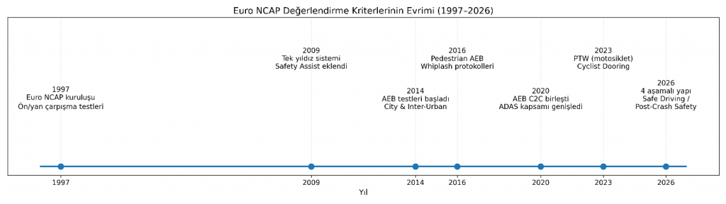 2026 yılı itibari ile uygulanacak protokollerdeki değişiklere geçmeden önce Euro NCAP değerlendirme yaklaşımındaki kritik tarihi basamaklardan bahsetmek faydalı olabilir. Şekil 1’de test metodolojisindeki kritik değişim noktaları Euro NCAP değerlendirme sisteminin yaklaşık otuz yıllık evrimini açık biçimde ortaya koymaktadır. İlk dönem (1997–2008), ağırlıklı olarak ön çarpışma ve pasif güvenlik testlerine odaklanırken; 2009 yılında yıldız derecelendirme sisteminin benimsenmesiyle birlikte aktif güvenlik ve sürücü destek sistemleri değerlendirme kapsamına dâhil edilmiştir.