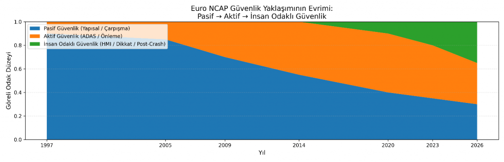 2014–2016 aralığında otonom acil frenleme (AEB) devreye alınması, değerlendirme yaklaşımını kazaların önlenmesine doğru yönlendirmiştir. Ancak bu durum pasif güvenlik kriterlerinden vazgeçildiği anlamına gelmemektedir zira aynı yıllarda devreye alınan boyun kamçı yaralanması (whiplash) protokolleri kaza sonrası önlemlerinde arttırılmaya devam ettiğinin göstergesidir. 2020 sonrasında ise ADAS kapsamı genişletilmiş ve gerçek trafik kazası senaryolarına daha yakın testler uygulanmaya başlamıştır. 2023 yılında motosikletli yol kullanıcıları ve bisikletli “dooring” senaryolarının değerlendirmeye alınması, yüksek riskli yol kullanıcılarına verilen önemin arttığını göstermektedir. Şekil 2’de Euro NCAP’in güvenlik yaklaşımının evrimi görülmektedir. Başlarda yıldız derecelendirmesinin ana belirleyicisi, gövde yapısı, emniyet kemeri/airbag sistemleri ve çarpışma dayanımı gibi pasif güvenlik unsurları iken; 2000’lerin ortalarından itibaren aktif güvenlik yaklaşımları ve özellikle ADAS tabanlı çarpışma önleme/azaltma fonksiyonları hızla önem kazanmıştır. Bu dönüşüm, “kaza olduktan sonra yolcu koruması” paradigmalarından “kazayı hiç oluşturmadan riskin düşürülmesi” paradigmasına geçişi temsil etmektedir. 2010’ların ortasında aktif güvenliğin payı tepe noktalara yaklaşırken, 2020’lerin ortasına doğru üçüncü bir katman daha belirginleşmektedir: insan odaklı güvenlik. Bu yaklaşım, sürücü izleme ve dikkat/uyku/dağınıklık tespiti, HMI (insan–makine arayüzü) uyumu, ADAS’ın yanlış kullanımını azaltacak etkileşim tasarımı ve kaza sonrası (post-crash) süreçlerin yönetimi gibi başlıkları öne çıkarmaktadır. Euro NCAP metodolojisinde yapısal bir paradigma değişimine giderek bu üçüncü katmanın etkinliğinin dikkate alınabilmesi için 2026 protokolleri ile taşıt güvenliğini; güvenli sürüş, çarpışma önleme, çarpışma koruması ve kaza sonrası güvenlik olmak üzere dört ardışık aşama altında ele alacağını duyurmuştur.