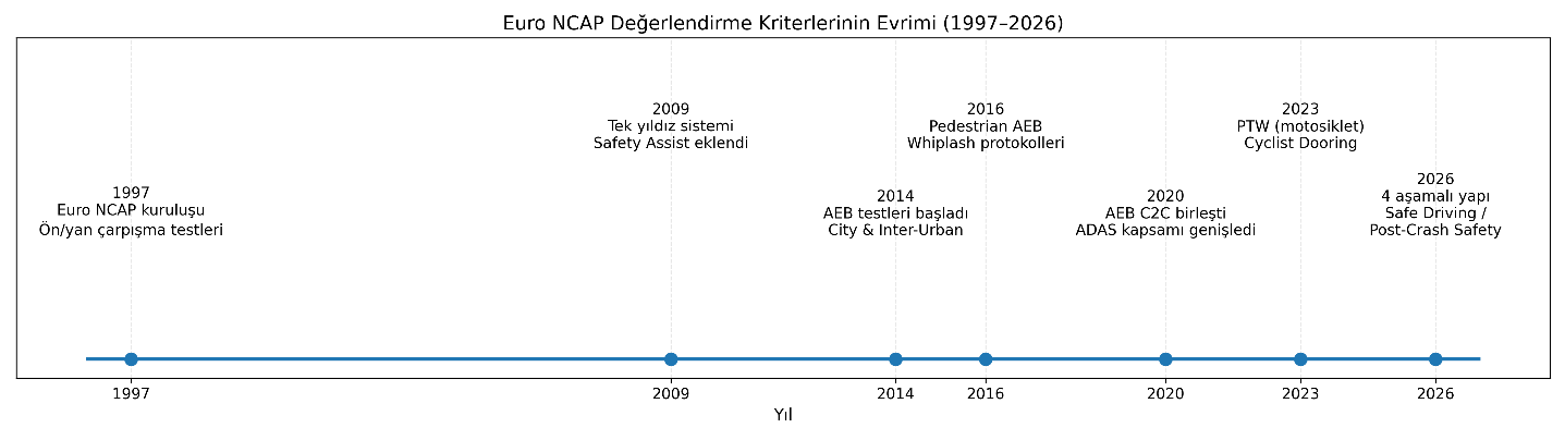 2026 yılı itibari ile uygulanacak protokollerdeki değişiklere geçmeden önce Euro NCAP değerlendirme yaklaşımındaki kritik tarihi basamaklardan bahsetmek faydalı olabilir. Şekil 1’de test metodolojisindeki kritik değişim noktaları Euro NCAP değerlendirme sisteminin yaklaşık otuz yıllık evrimini açık biçimde ortaya koymaktadır. İlk dönem (1997–2008), ağırlıklı olarak ön çarpışma ve pasif güvenlik testlerine odaklanırken; 2009 yılında yıldız derecelendirme sisteminin benimsenmesiyle birlikte aktif güvenlik ve sürücü destek sistemleri değerlendirme kapsamına dâhil edilmiştir.